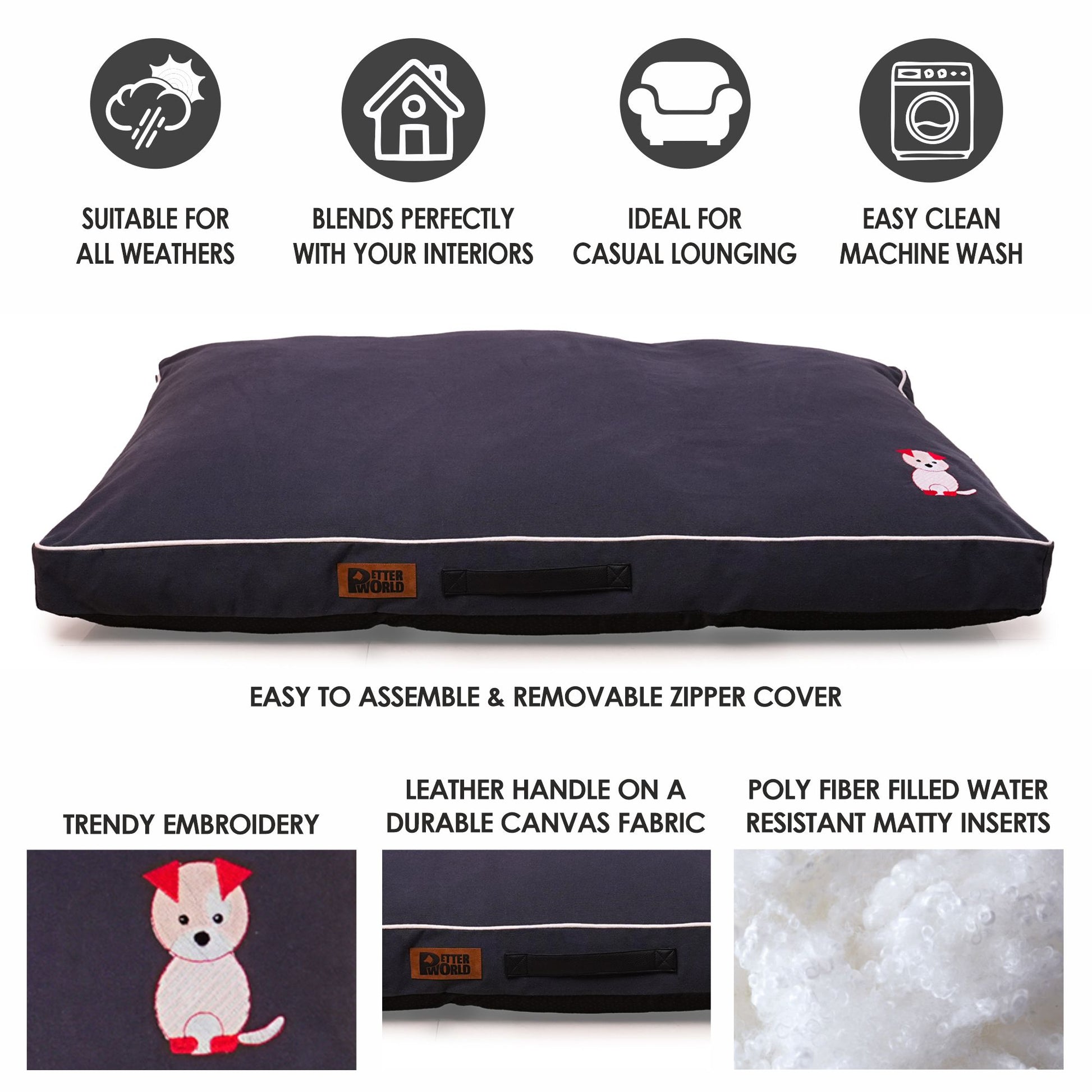 Our comfortable and stylish Rectangular Cushion Beds are a classic addition to your Pet wardrobe. Made from thick & durable outdoor fabric that is water & dust resistant. This bed is soft, roomy and at the same time strong & sturdy. High quality Virgin poly fiber filled cushion provides and necessary support and comfort, which the pet deserves. It is a luxuriously comfortable bed with embroidered perimeter that provides artisanal aesthetics. It is great for pets of all ages & breeds, and comes available in multiple colors and sizes, so you can select the right bed that suits your home décor as well. Gift your pet a comfortable resting time with our Luxury Cushioned Pet Bed.