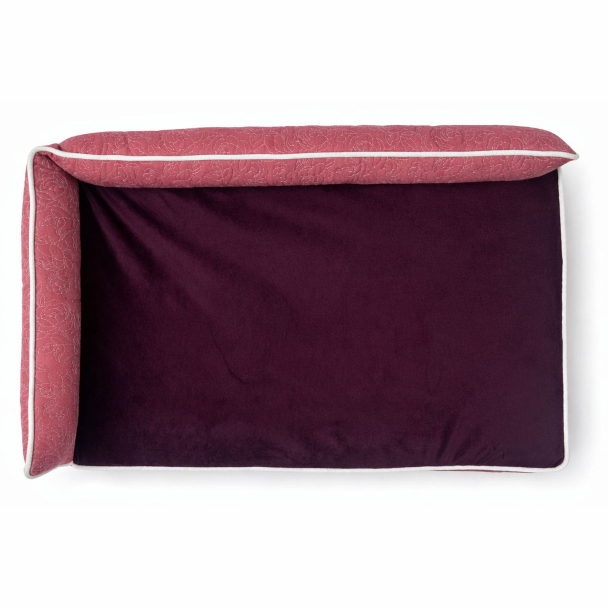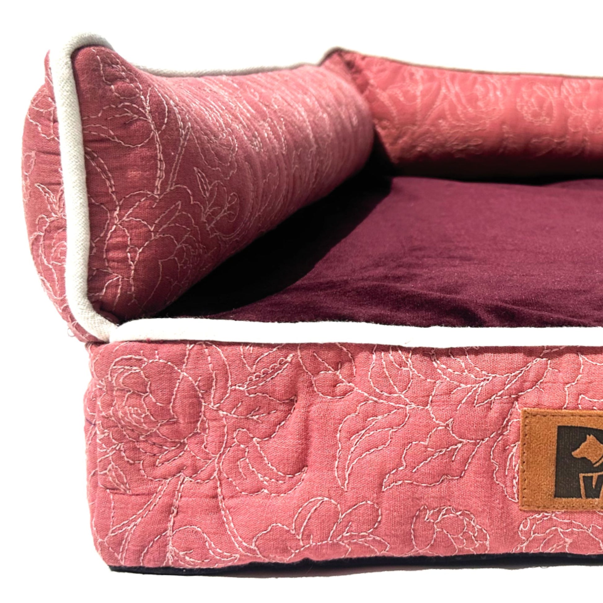 The plush coral fur sleep surface offers a soft, calming touch, while the quilted embroidered outer fabric gives the bed a refined, furniture-like finish.