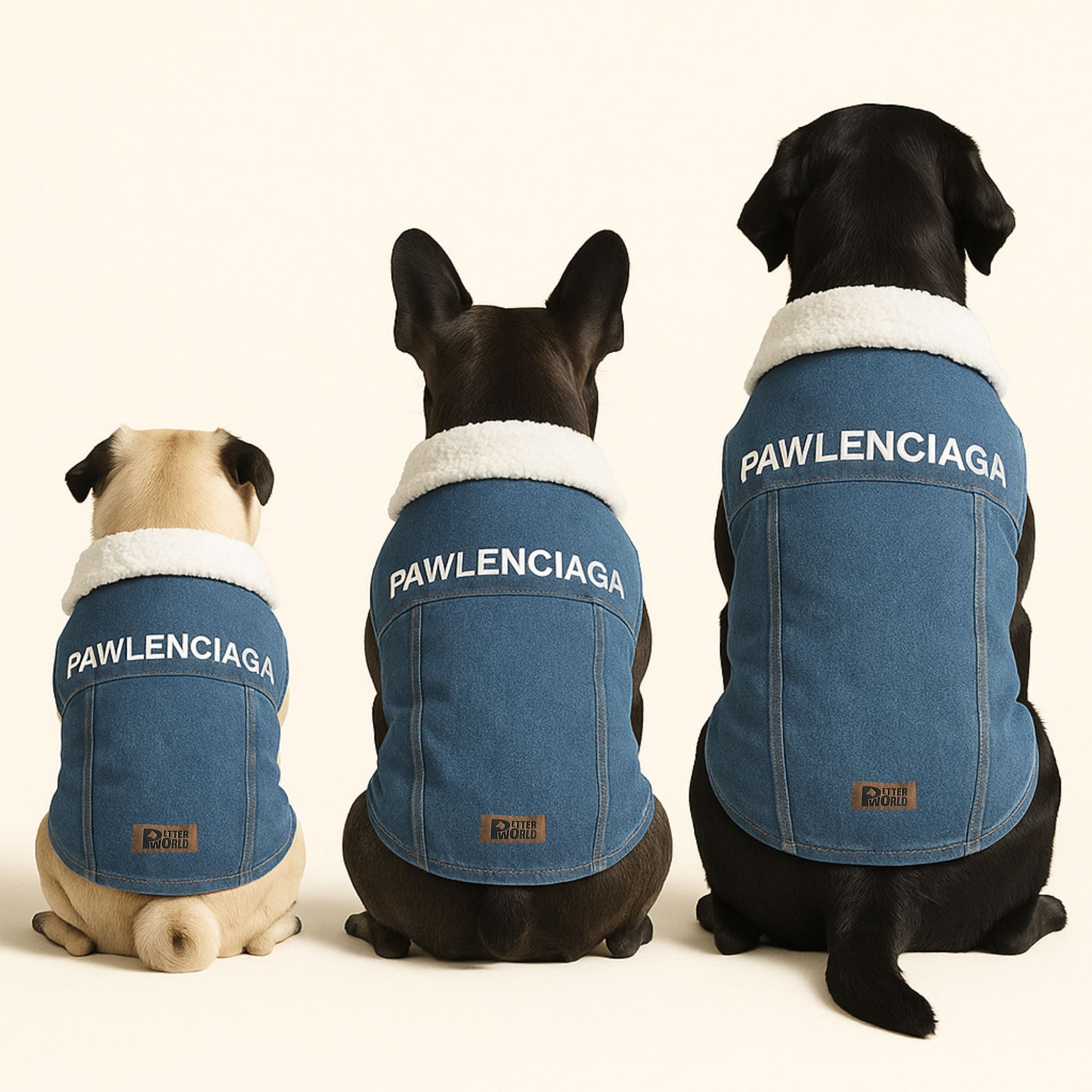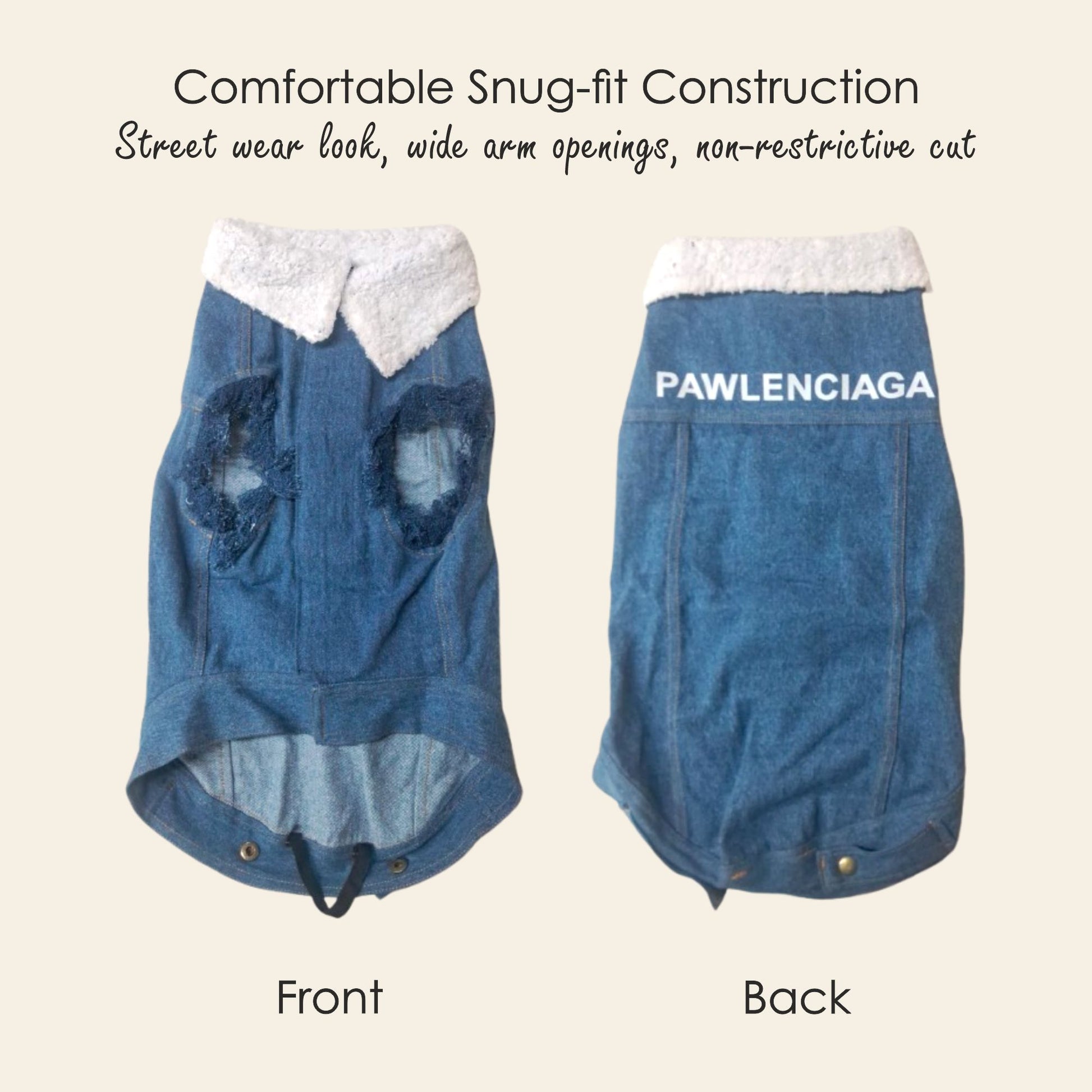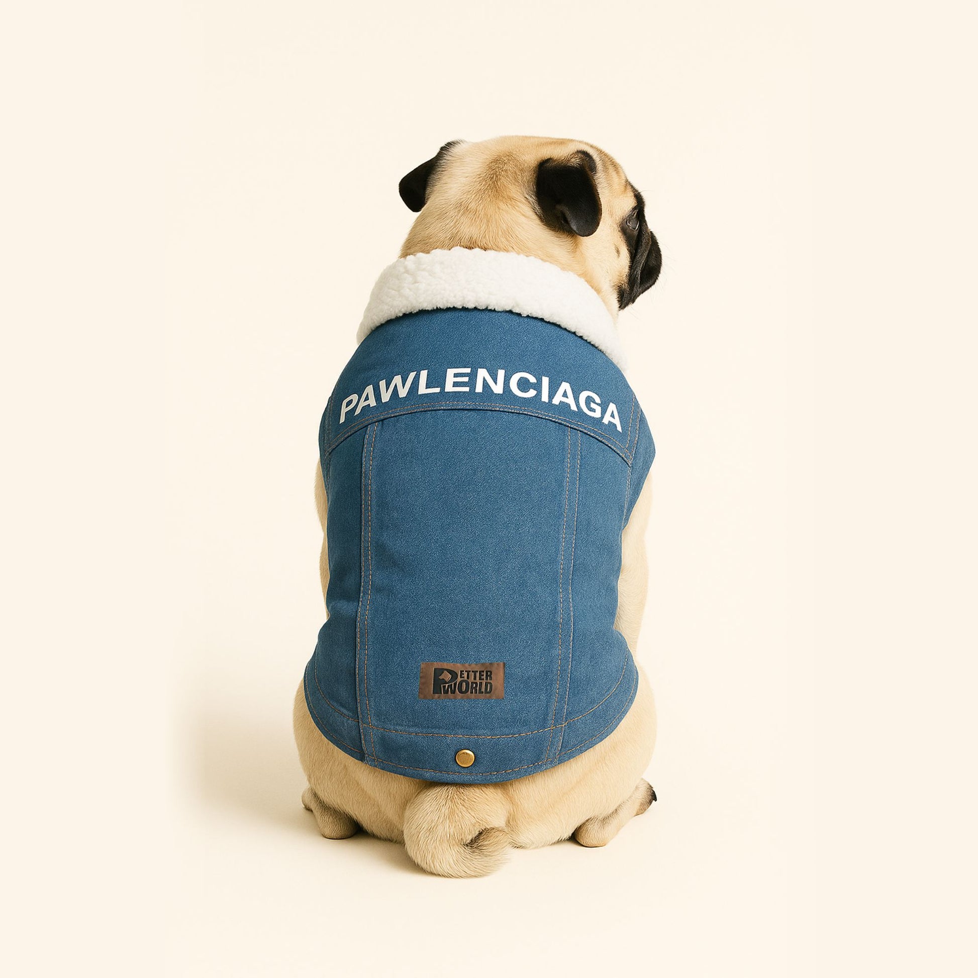 On the back, bold PAWLENCIAGA branding adds a designer-inspired edge, turning your pet into a true winter trendsetter. Whether you’re looking for functional warmth or fashion-first outerwear, this denim sherpa jacket is built to elevate your dog’s winter wardrobe.