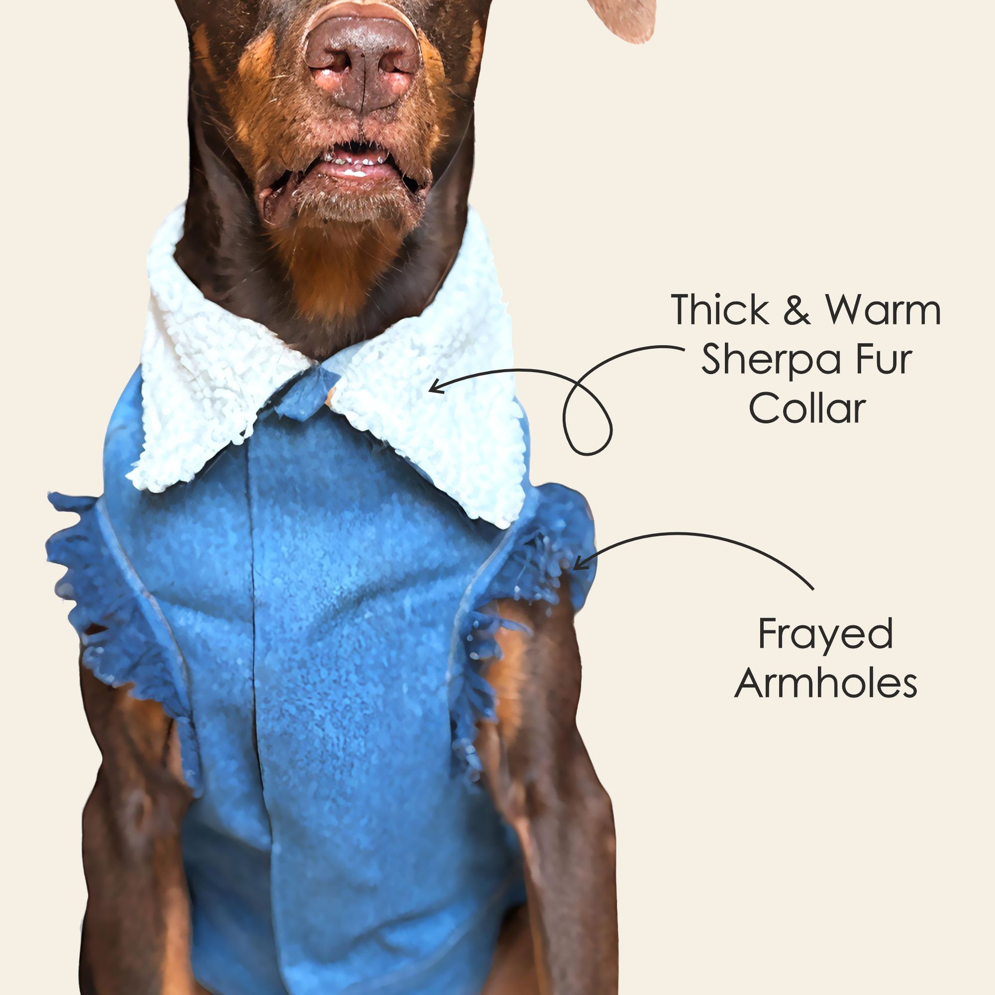 The thick white sherpa collar adds extra neck warmth and gives your dog an elevated street-style look inspired by classic winter denim fashion.