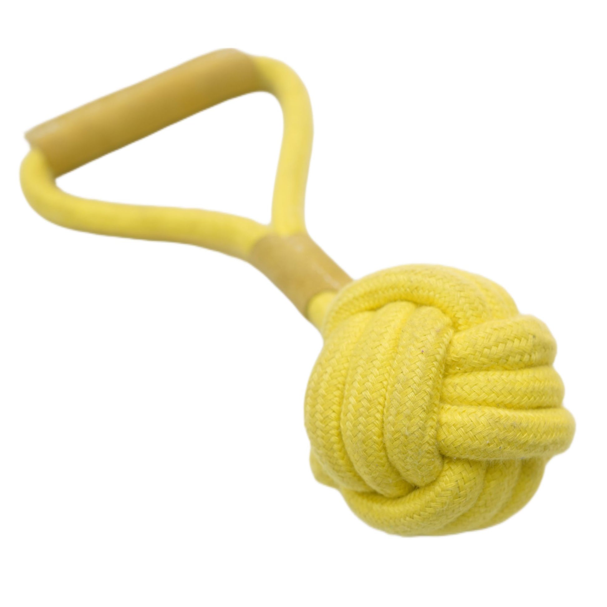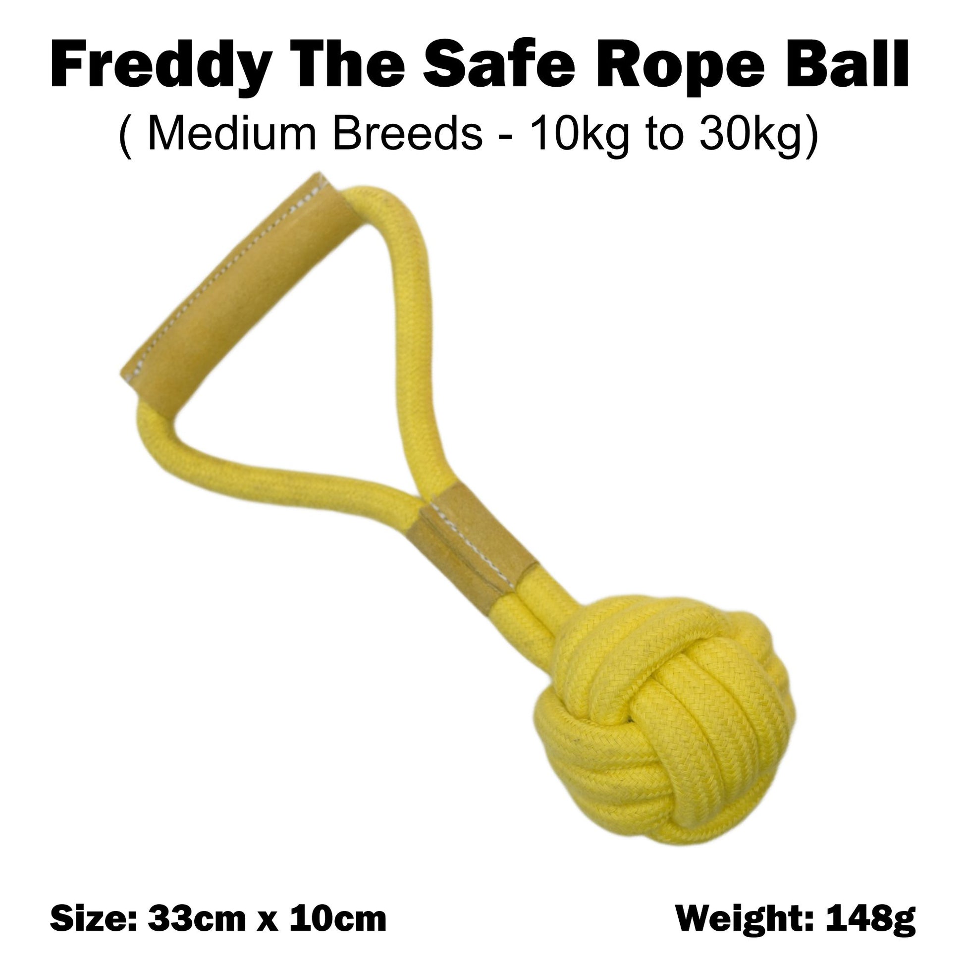 Take your pup on a walk on the wild side with Freddy the Safe Rope Ball! This popular pup toy is designed to last, with a durable Cotton Jute rope with a Suede handle that stands up to all your dog's chewing and tugging needs. Not only will your pet have a blast playing with this bestseller, but you'll also have peace of mind knowing it's specially designed for their safety!